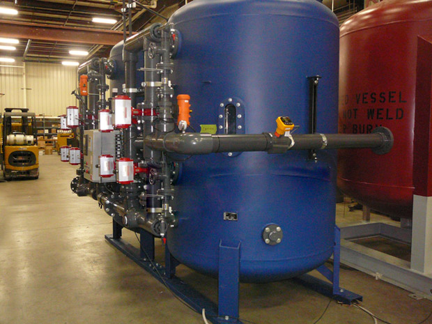 水處理的沉淀和澄清過程,把水中一部分較大的固體顆粒或容易沉降的雜質(zhì)加以去除,但要進一步使水凈化,就得利用過濾的方法,使水通過石英砂過濾器中從上而下、由小而大的不同顆粒的濾料層后,將水中的細小顆粒、膠體、有機物等雜質(zhì)截留下來,從而使水得到進一步的澄清和凈化,降低水的渾濁度。根據(jù)設(shè)備水頭損失的情況或過濾器運行的時間確定石英砂過濾器的反沖時機。通過石英砂過濾器上所配置的各類閥體的開合對設(shè)備內(nèi)部石英砂濾料進行反沖洗,將沉積在介質(zhì)上的雜物沖洗干凈后,設(shè)備隨即又進入了一個新的過濾周期。